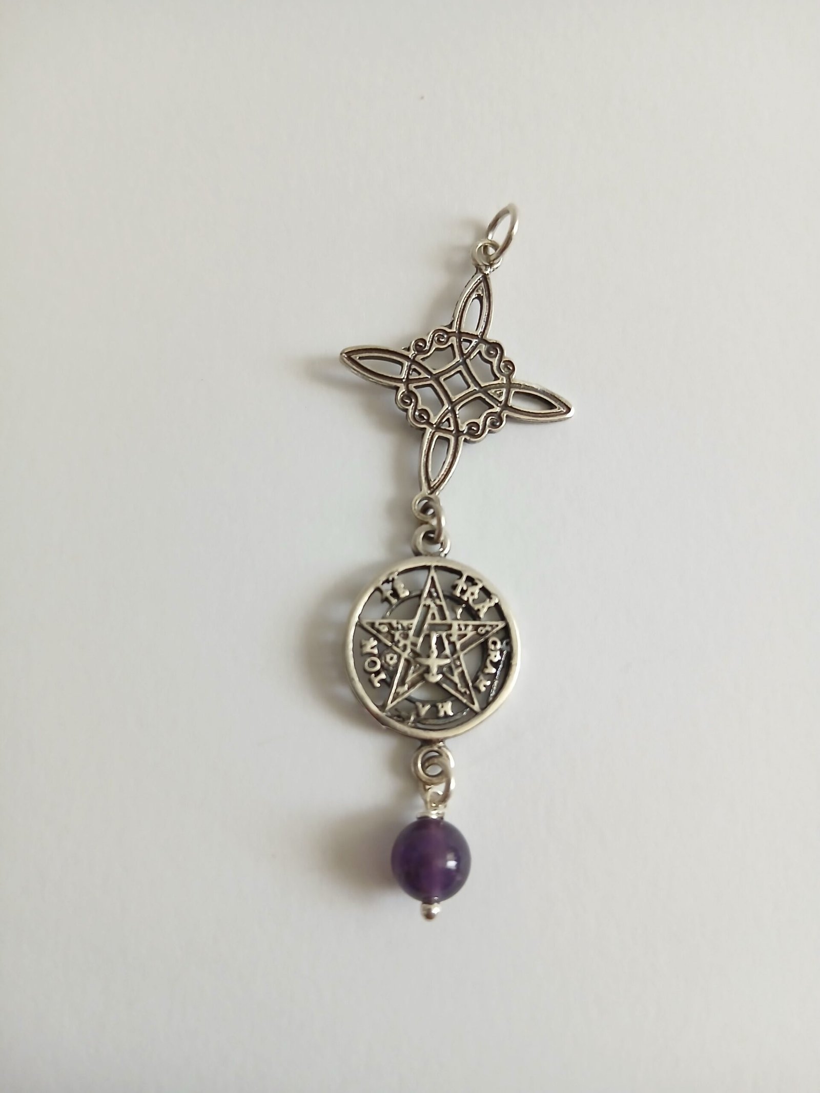 Colgante nudo de bruja con tetragramaton y amatista. 6cm. sin cadena. Plata de Ley envejiza