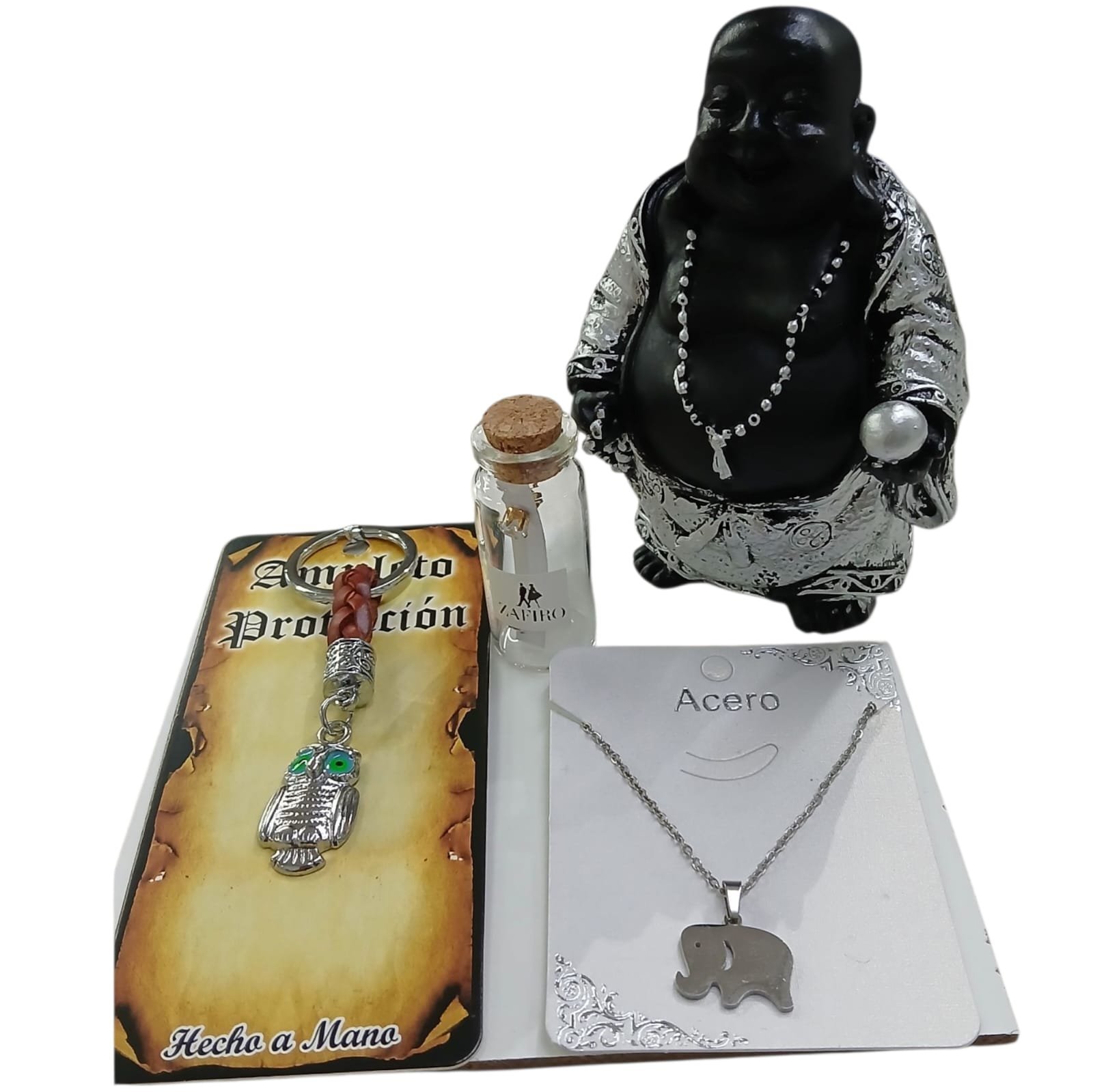 Pack Llavero de buho, Colgante de Elefante, Pendientes con brillo y Figurita de Buda